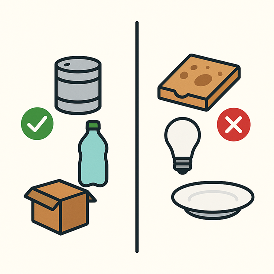 - Szkło, które nie jest szkłem opakowaniowym – talerze, żarówki czy lustra nie powinny trafiać do pojemnika na szkło, ponieważ mają inny skład i utrudniają recykling.